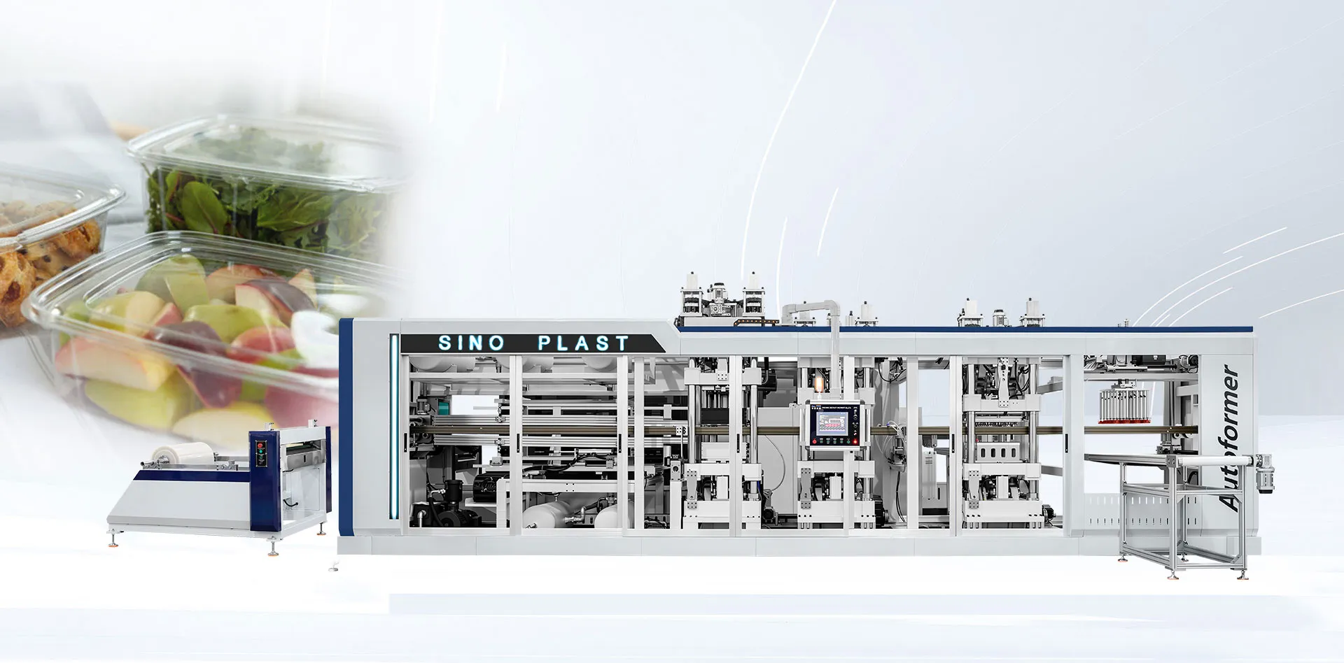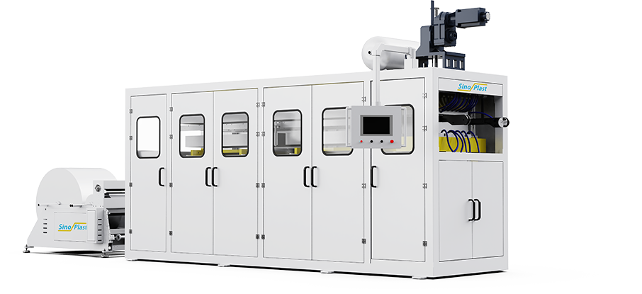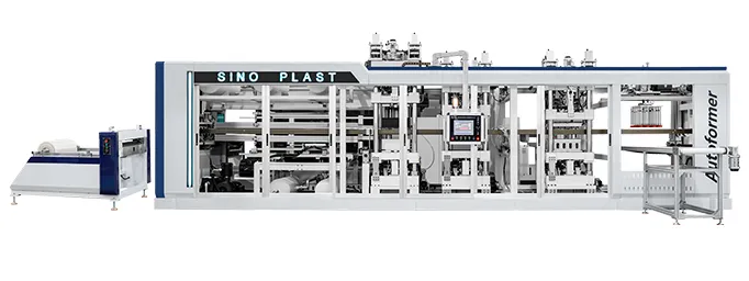 آلة تشكيل البلاستيك بالحرارة من سينوبلاست مزودة بأحدث هيكل محرك، وسرعة أعلى، و40 قالبًا من مادة PET/الدقيقة و30 قالبًا من مادة PP/الدقيقة، مع ثبات أعلى.